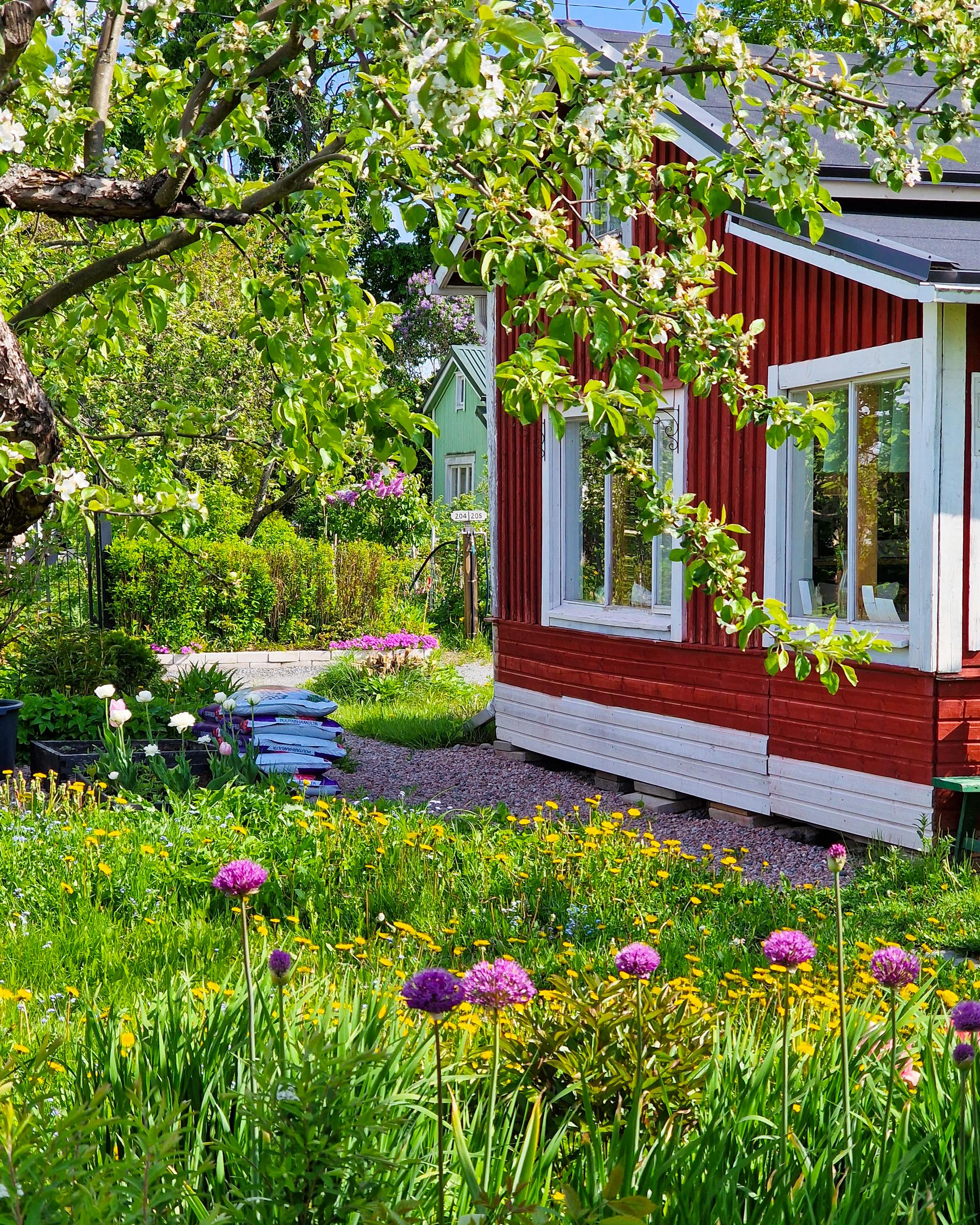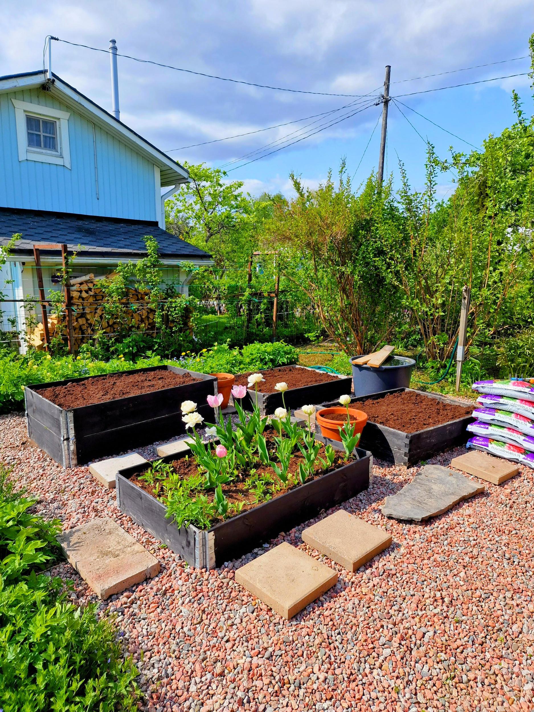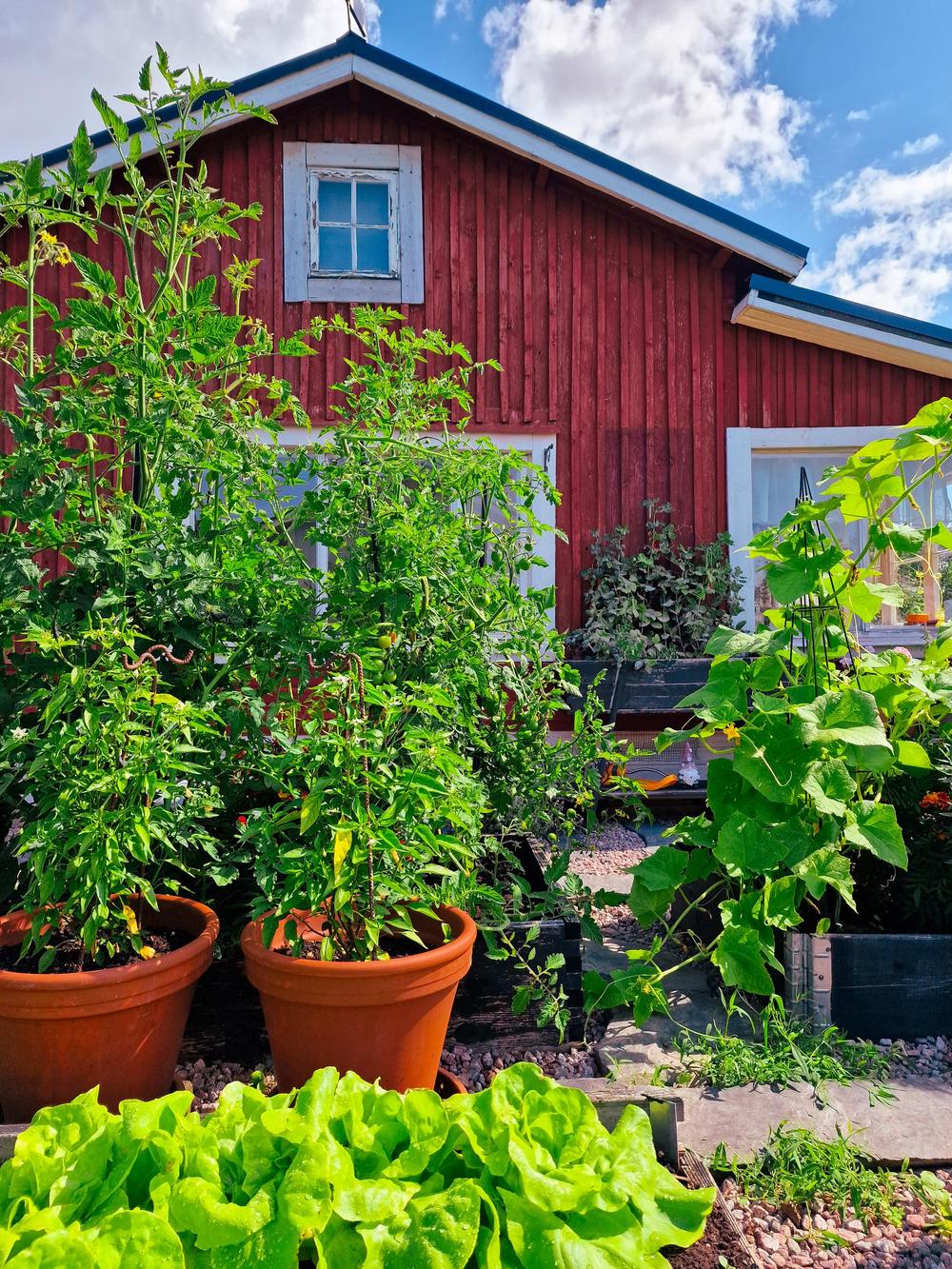 Noin 300m2 kokoiselle palstalle on rakennettu monipuolinen hyötypuutarha kasvatuslavoista ja ruukuista. Täällä kukoistavat niin perunat, kaalit, tomaatit kuin yrtit ja leikkokukatkin. Tontilla on neljä omenapuuta, valtavasti raparperia, vanhoja pioneja sekä vuosikymmeniä vanha, upea perennapenkki. Kulkureitit on tyylikkäästi viimeistelty somerolla ja liuskekivillä. Etupihalle on aloitettu oman niityn perustaminen kesällä 2024. Vanhat tuijat tuovat pihapiiriin yksityisyyttä ja rauhaa.