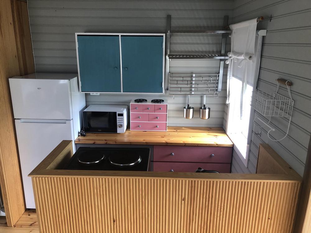 Mökissä on hyvä varustetaso mm. jääkaappi pakastelokerolla, hella/uuniyhdistelmä, vedenkeitin, kaapistot, astiakaappi jne.