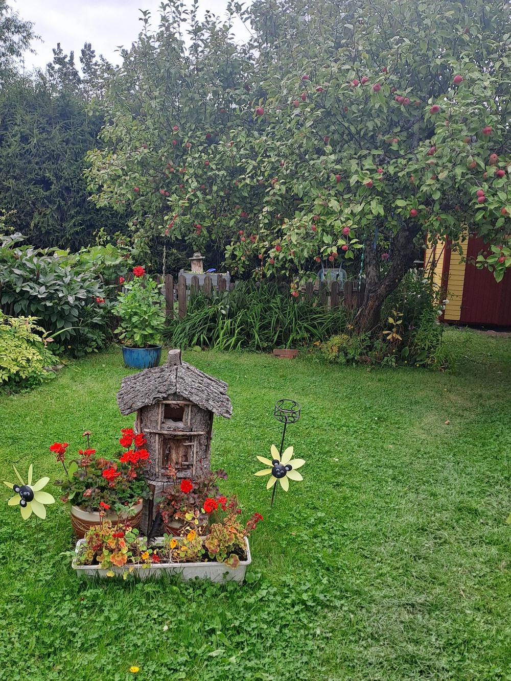 Tontilla on 3 eri lajikkeista omenapuuta ja marjapensaita sekä puutarhavaja.